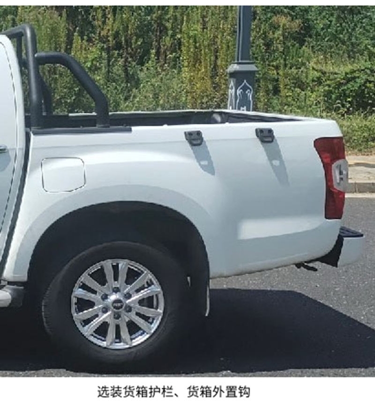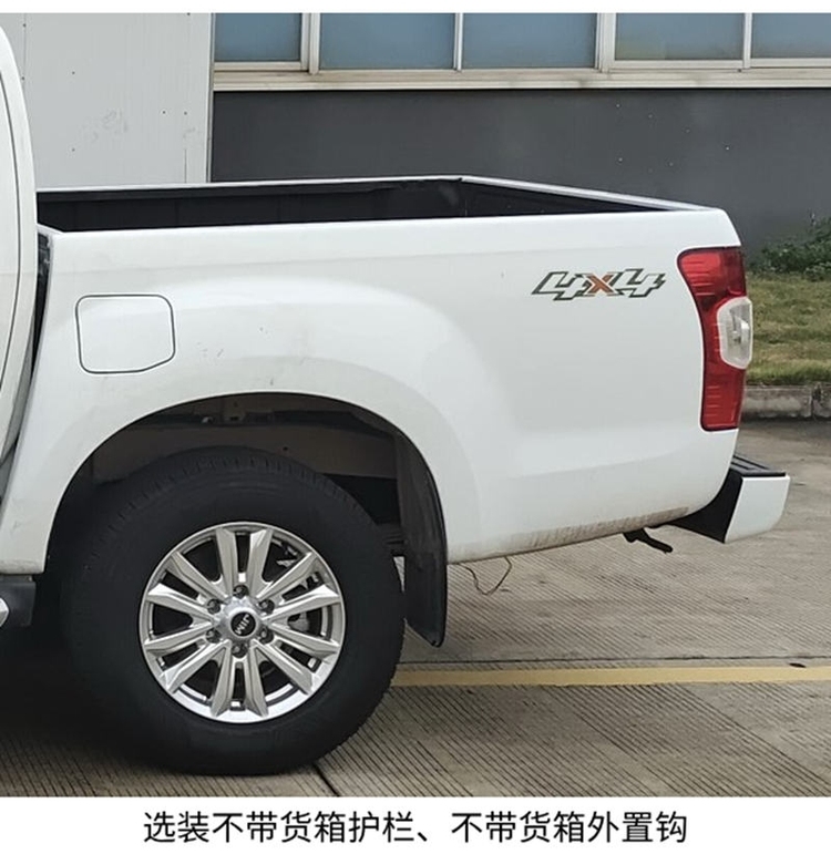 车身尺寸方面,新车轴距3095mm,长宽高为5330*1860*1775(1785,1830)mm,货箱尺寸1480*1530*480mm,为标轴车型。额定载质量485kg,轮胎尺寸245/70R17,后部为5片钢板弹簧的样式。其他配置方面,侧踏板、尾部标识、天线、门把手、尾门把手、后风窗标识、倒车雷达、货箱护栏等均为区别不同车款的配置。